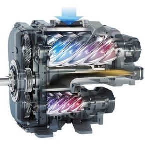 В двухступенчатом винтовом компрессоре имеются две винтовые пары, соответственно на 1-ой и 2-ой ступенях. Они находятся в одном блоке и приводятся во вращение одним электродвигателем. В 1-ой ступени воздух сжимается до 3 бар, затем поступает во 2-ую ступень, где дожимается до 8 бар. В обычном компрессоре степень сжатия 9, в двухступенчатом компрессоре на 1й и 2й ступенях около 3.